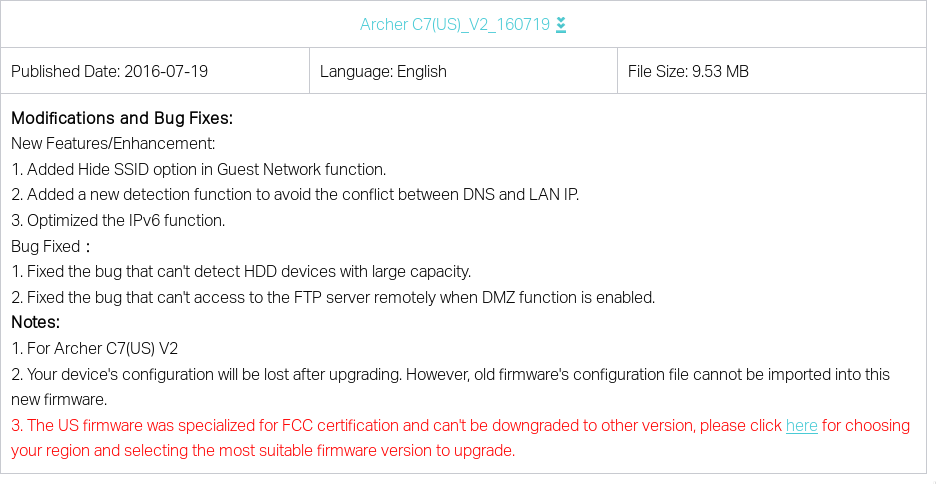 3. The US firmware was specialized for FCC certification and can't be downgraded to other version, please click [here](http://www.tp-link.com/us/choose-your-location.html) for choosing your region and selecting the most suitable firmware version to upgrade.